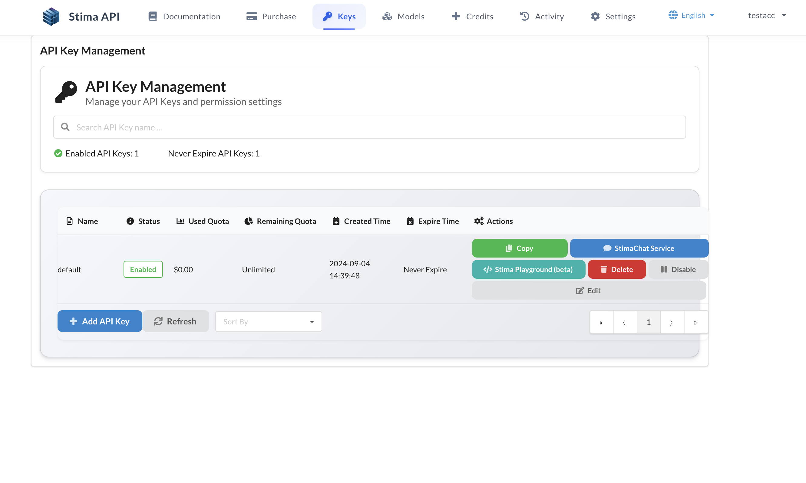 Once you log in and create an API Key, each key will have a blue [StimaChat Service] button next to it. Click this button to use the corresponding API Key for chatting.
